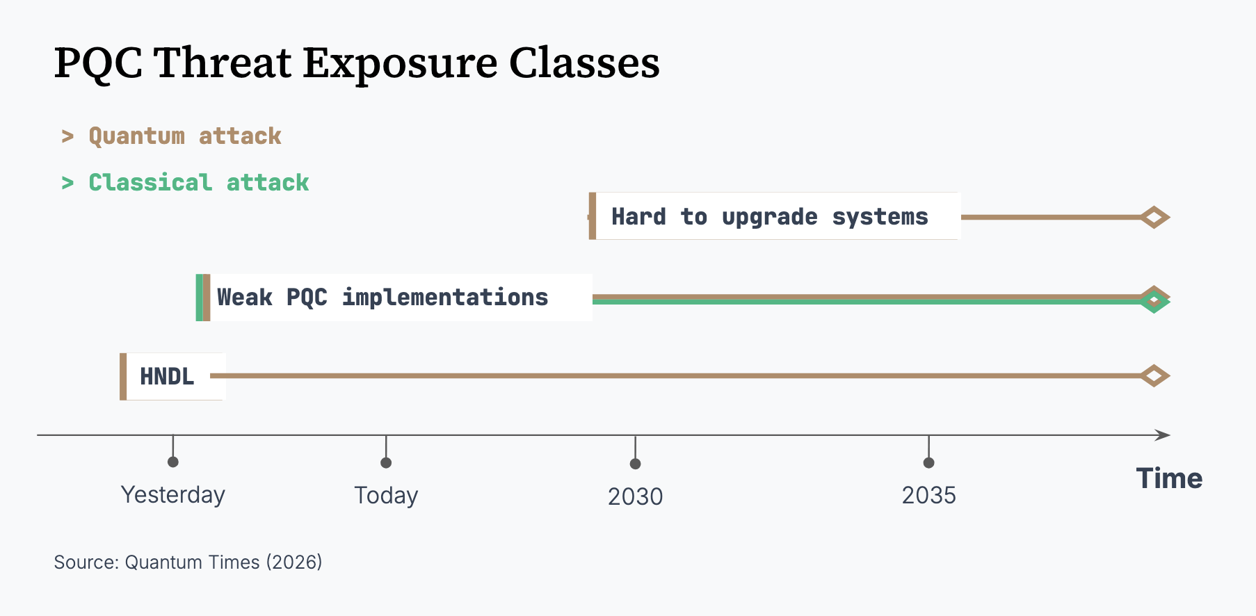 In this scenario, risks concentrate around three main exposure types (see illustration): long-lived data (HNDL), weak PQC implementations, and systems that could not migrate to PQC.