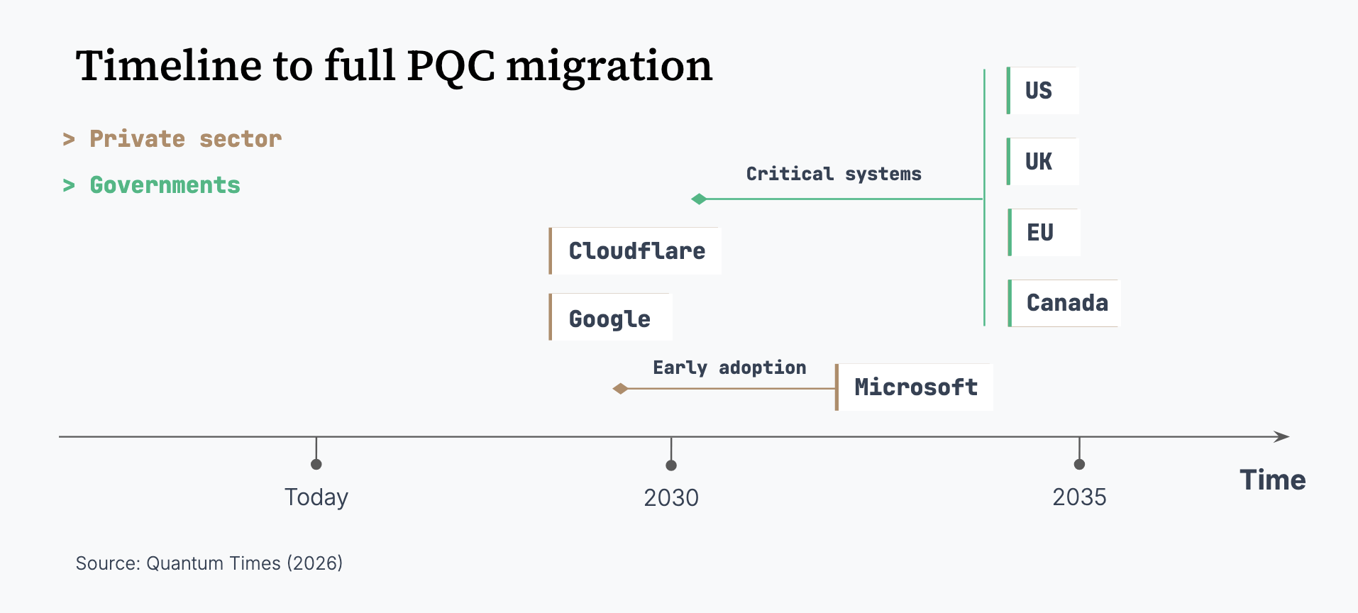 Governments are also structuring this transition and most of them target the 2035 deadline for full migration, though most of them also urge agencies to start the transition of critical systems as soon as possible. For instance, the European Commission has published a Coordinated PQC Transition Roadmap that requires all EU member states to begin deploying post-quantum encryption by 202627. Canada aimed at completion of PQC migration of high priority systems by end of 203128. The US National Security Agency also published a report in 2025 in which it “expects the transition to QR [Quantum Resistant] algorithms for NSS [National Security Systems] to be complete by 2035”29.