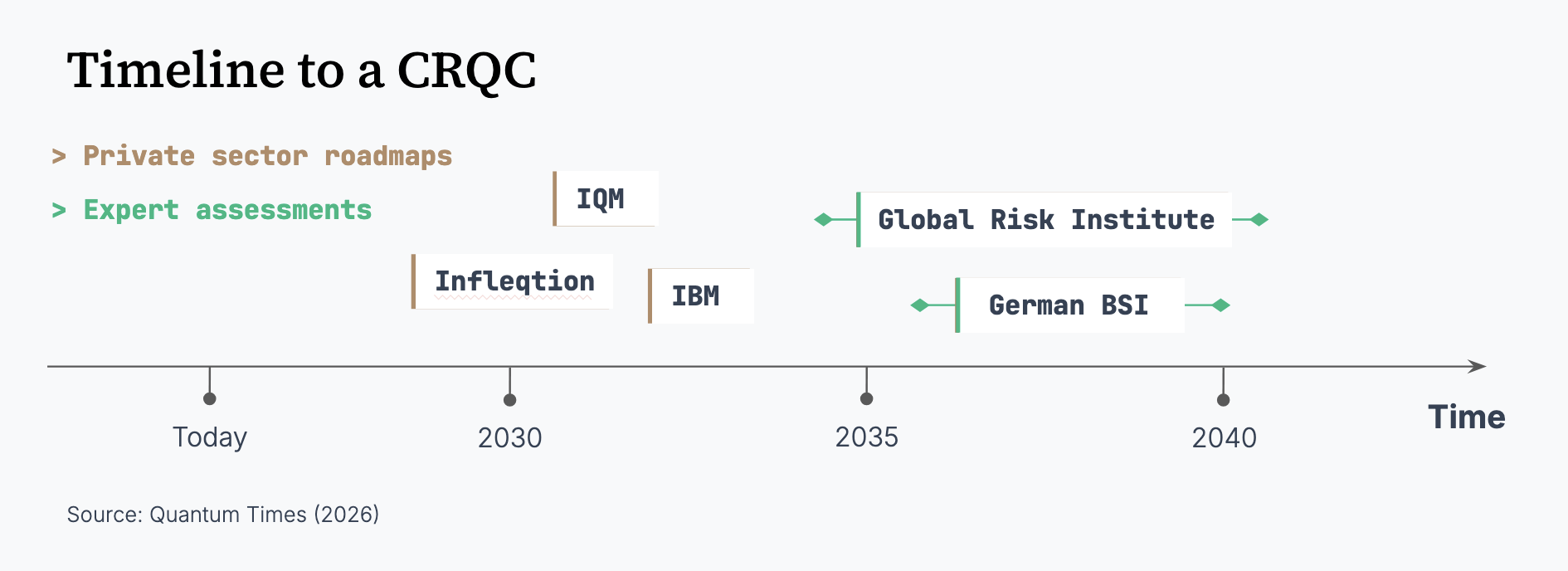 Since the late 2010s, following milestones such as Google Quantum AI’s 2019 “quantum supremacy” demonstration, the debate has shifted from if to when3. Recent expert surveys reflect this shift, with a CRQC by 2035 now within the realm of possibility. The latest report from the Global Risk Institute (published in March 2026) places the 10-year likelihood of a CRQC between 28% and 49%, the highest level recorded to date4. Government risk assessments point in the same direction: the US Department of Homeland Security assumed that a CRQC could be “potentially available” as early as 20305 and the German Federal Office for Information Security (BSI), in its 2025 update on the status of quantum computer development, estimated that a CRQC could emerge within 10-15 years6.