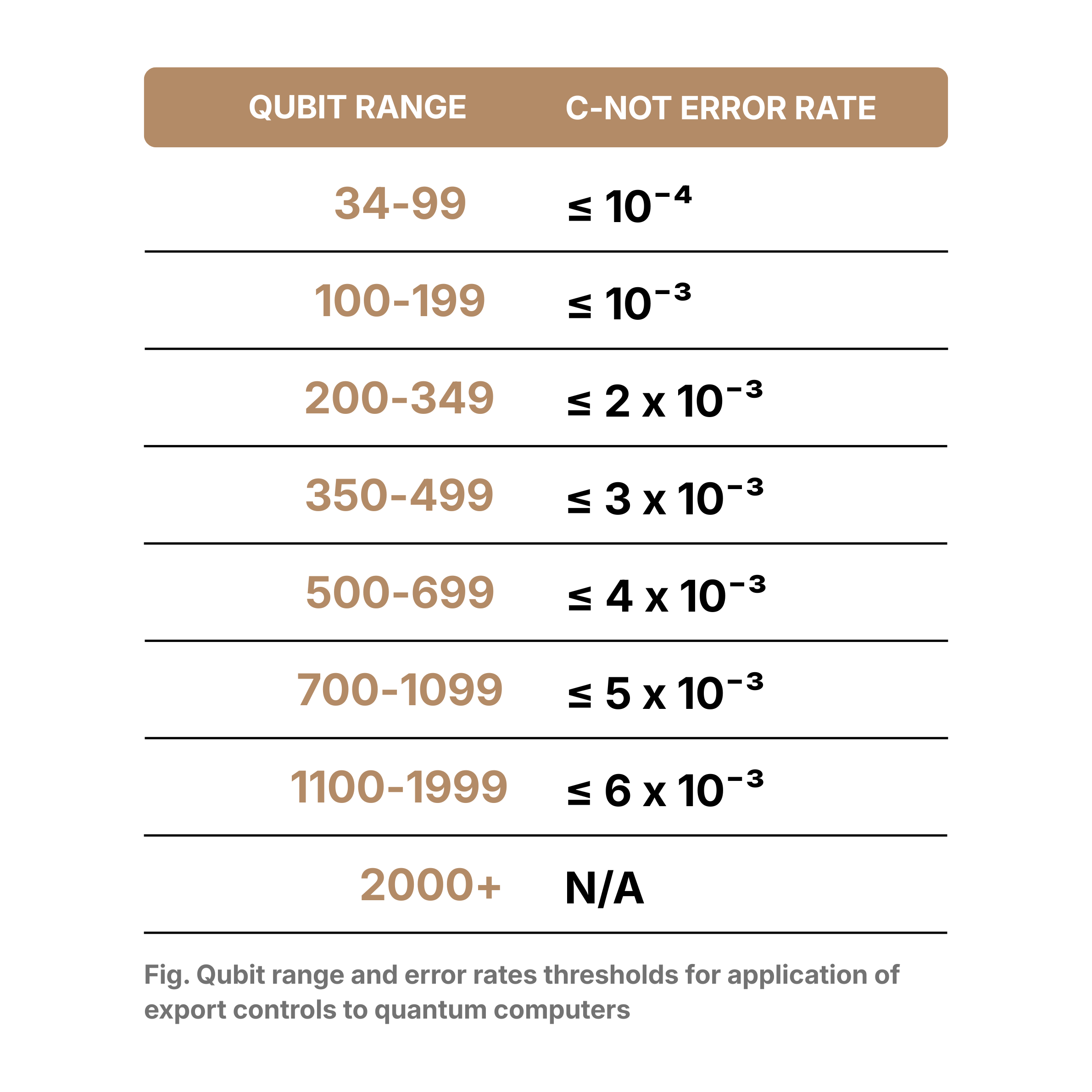 Export controls on quantum computing systems22 apply only to gate-based and measurement-based machines that meet a threshold of two-qubit (CNOT) fidelity, focusing on devices capable of meaningful, scalable computation. This reflects the understanding that systems with many low-quality qubits may perform no better than smaller, high-fidelity machines. Adiabatic and annealing quantum systems are explicitly excluded from these controls.