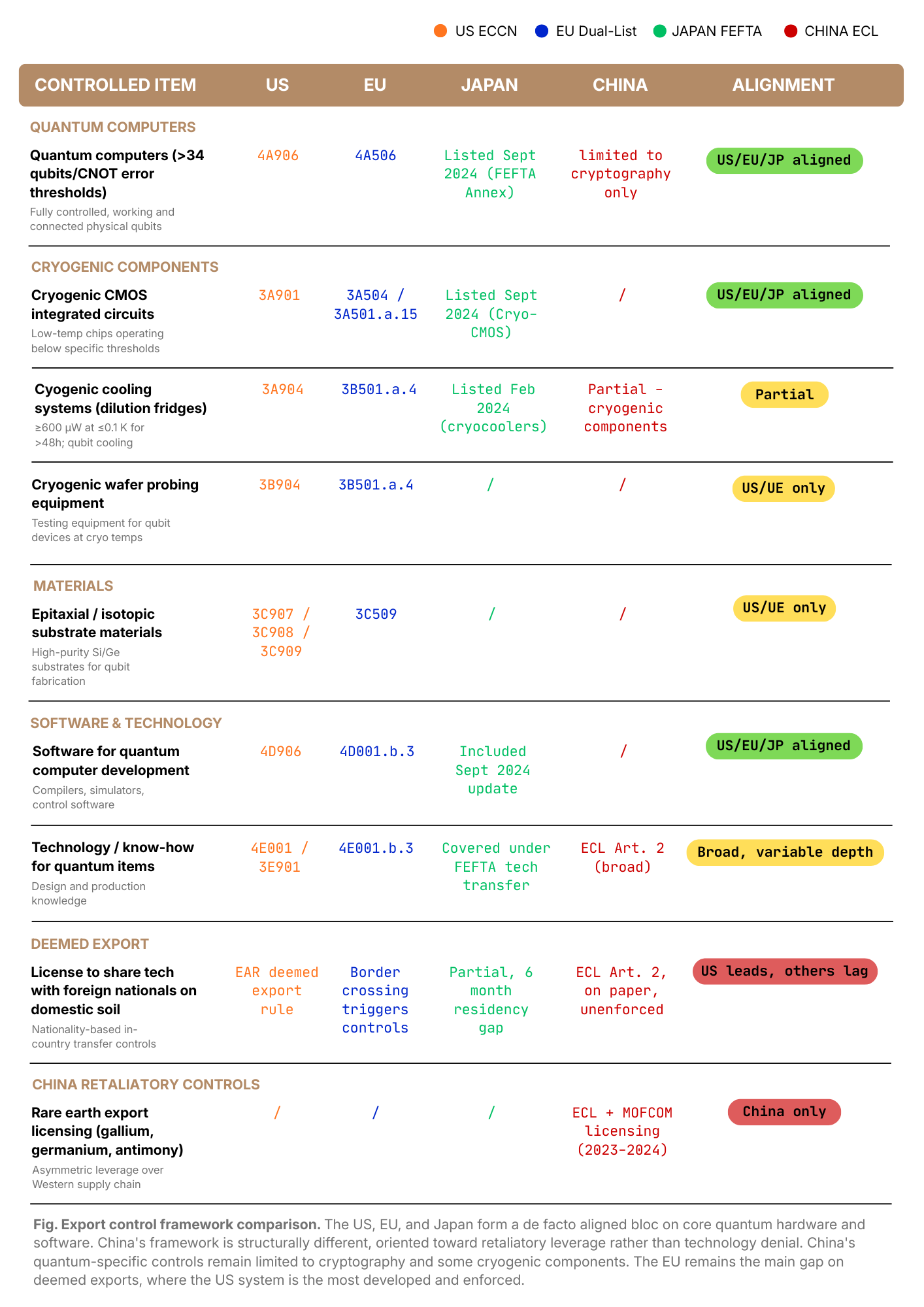 Japan’s September 2024 update to its FEFTA21 controlled list was notably swift and comprehensive, covering quantum computers, cryo-CMOS circuits, and related software in one move, and doing so in close coordination with Washington, consistent with Japan’s broader posture since 2022, when it joined the US-led semiconductor controls on ASML-equivalent equipment.